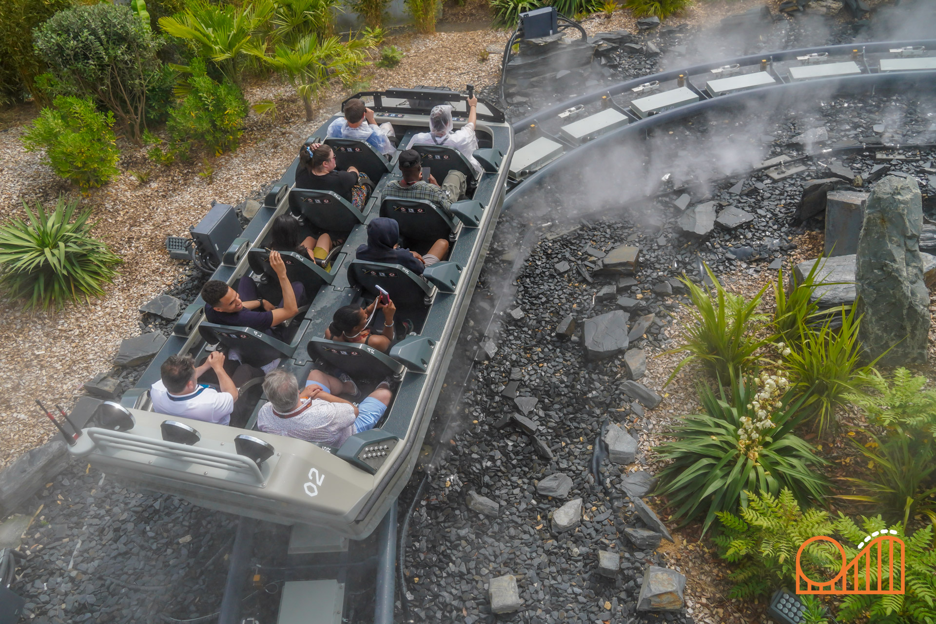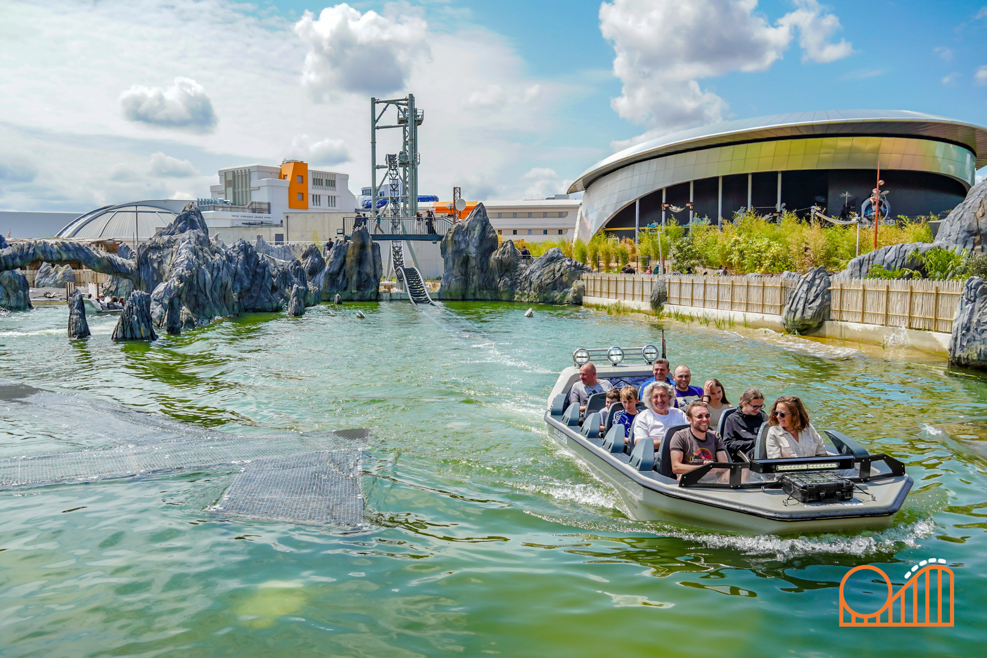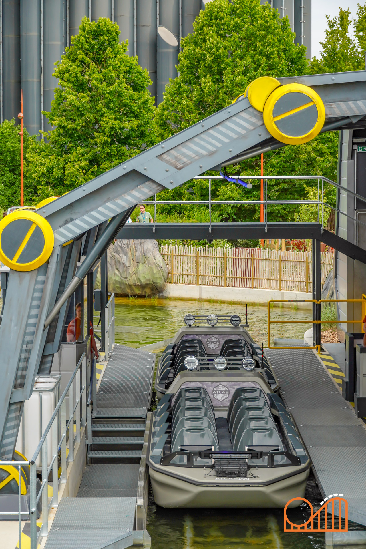 A vertical rotating lift leads to the climactic moment: a 16-meter plunge through a “space-time portal”—a visual metaphor replacing what was once planned as a volcano-themed finale. While this exposed tower and modest indoor lead-up might feel underwhelming compared to the original dark ride plans, the final drop still delivers a rather satisfying splashdown at 60 km/h.