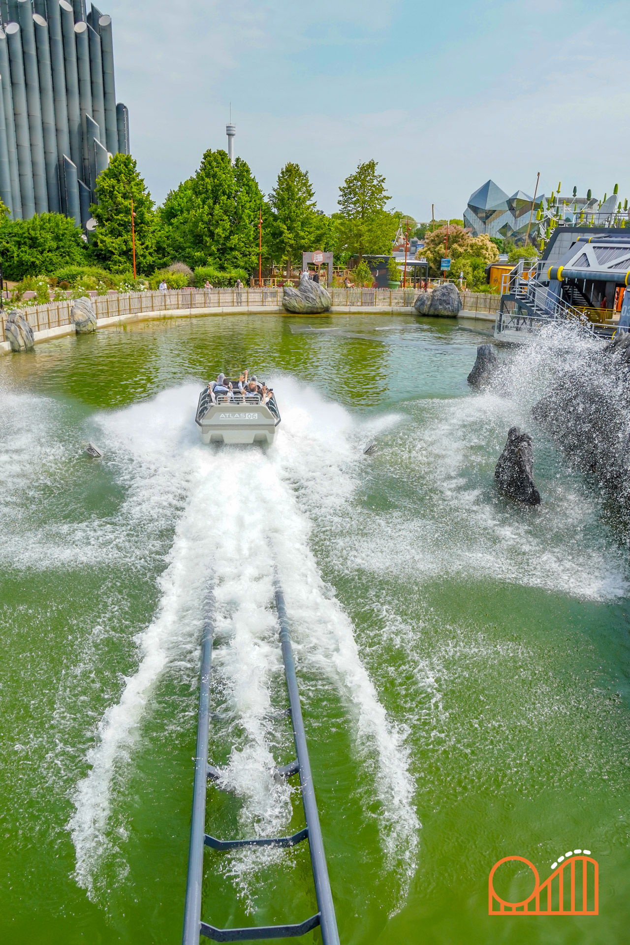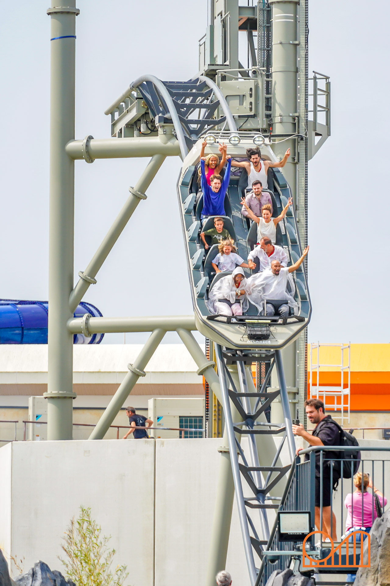 A vertical rotating lift leads to the climactic moment: a 16-meter plunge through a “space-time portal”—a visual metaphor replacing what was once planned as a volcano-themed finale. While this exposed tower and modest indoor lead-up might feel underwhelming compared to the original dark ride plans, the final drop still delivers a rather satisfying splashdown at 60 km/h.